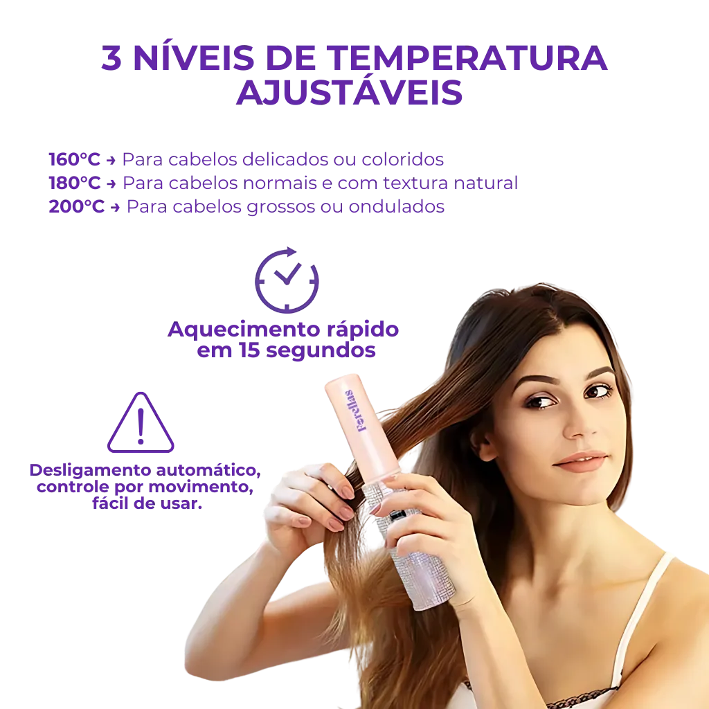 Com 3 níveis de temperatura ajustáveis, você alisa, modela e protege seus fios sem esforço. Aquece em apenas 15 segundos e funciona até 1 hora sem precisar de fio ou tomada.
